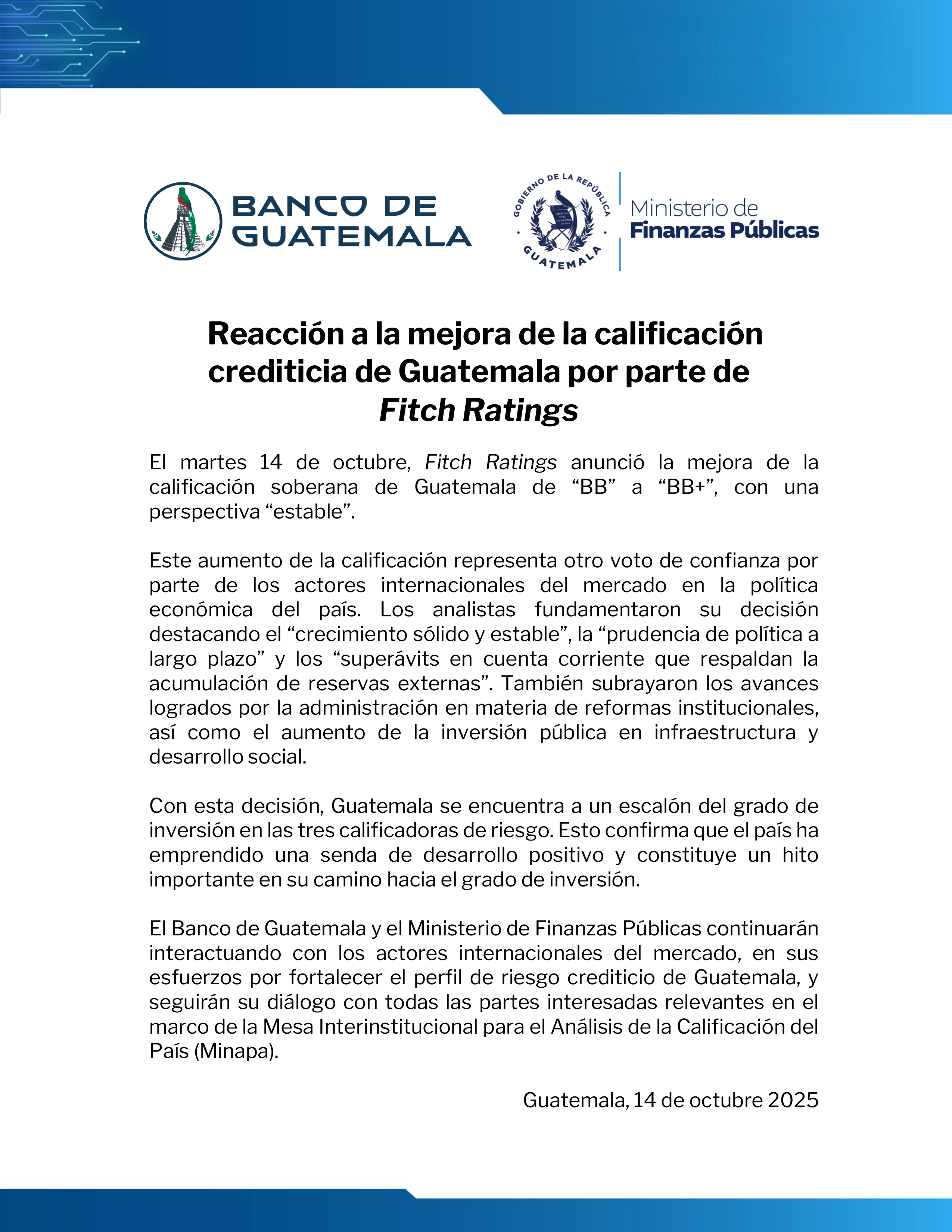Fitch Ratings eleva la calificación crediticia soberana de Guatemala de BB a BB+